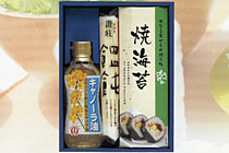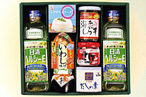 日清ヘルシーE600g×2本、あけぼの鮭フレーク×1瓶、海老しらす×1瓶、だしの素×1缶、全型焼きのり10枚入り×1袋 |